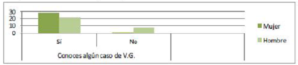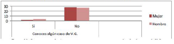 Cabe destacar que en relación a si conocen algún caso de violencia de género, las respuestas de ambos grupos son diferentes, ya que los jóvenes de centros normalizados responden en su mayoría que no y los pertenecientes al centro de menores contestan afirmativamente.