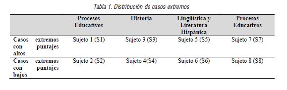 En la segunda fase, donde se aplicaron técnicas cualitativas, se elaboró un muestreo de casos extremos después de haber obtenido los resultado del instrumento cuantitativo (Flyvbjerg, 2004). De esta forma se armaron dos grupos de entrevista: el primero, conformado por los puntajes más altos de cada una de las licenciaturas, y el segundo, integrado por los puntajes más bajos. En ambos grupos la mayoría de sus integrantes accedieron a ser entrevistado a excepción de los estudiantes de Filosofía quienes se abstuvieron de participar en el estudio. En seguida, en la Tabla 1, se muestra la distribución de los sujetos por programa académico con su respectivo código