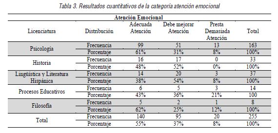 Para tener una visión global de los resultados del TMMS-24 por licenciatura se estructuraron los siguientes cuadros comparativos. En la categoría atención emocional resalta que las licenciaturas en Psicología y Filosofía perciben tener niveles adecuados de la habilidad con 61% y 62% respectivamente mientras que los programas de Historia y Procesos educativos cuentan con porcentajes del 48% y 43%. En la carrera de Lingüística y Literatura Hispánica solo el 38% de los estudiantes presentan una adecuada atención emocional. El resto de los estudiantes, el 45%, debe mejorar la habilidad