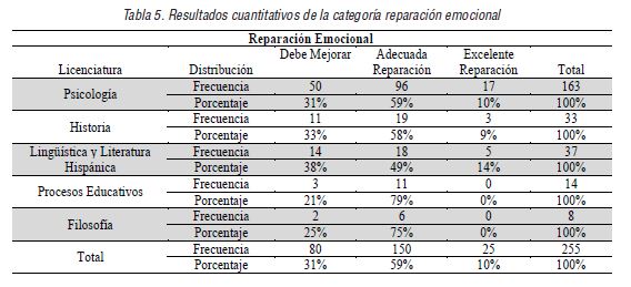 Resumen: En la literatura existen numerosos artículos que evalúan la Inteligencia Emocional en estudiantes universitarios, sin embargo, la mayoría de ellos solo contemplan el aspecto cuantitativo olvidando la experiencia personal del alumnado. Por lo anterior, este estudio busca analizar la variable en estudiantes de Ciencias Sociales y Humanidades a través de técnicas mixtas. Para cumplir con el propósito anterior, en la primera fase de la investigación, se aplicó el TMMS-24 (Trait Meta Mood Scale) a una muestra estatificada de 255 sujetos; en la segunda fase, con base a los resultados del primer instrumento, se seleccionaron 8 estudiantes que representan los casos extremos de cada licenciatura quienes dieron su consentimiento para participar en una entrevista semiestructurada diseñada para profundizar en las habilidades emocionales adquiridas a lo largo de la licenciatura. Los resultados señalan que los estudiantes con altos puntajes en el TMMS-24 tienden a describir mayor número de ejemplos dónde se identifica el desarrollo de habilidades de la IE en contraposición con sus pares de la misma licenciatura con bajos puntajes en el instrumento.