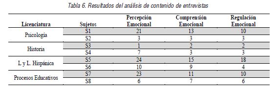 También sobresale que en cada licenciatura resalta el desarrollo de una habilidad específica de la IE. Por ejemplo en la parte cuantitativa, se encuentra que en Psicología más del 50% de los alumnos estudiados poseen una adecuada Atención Emocional y en Procesos Educativos más del 70% de sus estudiantes cuentan con una adecuada o excelente Claridad Emocional y Reparación Emocional. Las diferencias entre licenciaturas también se pueden apreciar desde el punto de vista cualitativo, por ejemplo en Lingüística y Literatura Hispánica se hacen numerosas referencias a la habilidad Percepción y expresión emocional, más que en ningún otro programa educativo, como se observa en los Sujetos 5 y 6. Esto mismo sucede en la habilidad Regulación Emocional, además durante la entrevista estos estudiantes destacaban por su fluidez en el discurso y capacidad de expresión. En relación a la habilidad de Comprensión Emocional son los casos de la Licenciatura en Procesos Educativos los que registran un mayor número de intervenciones.