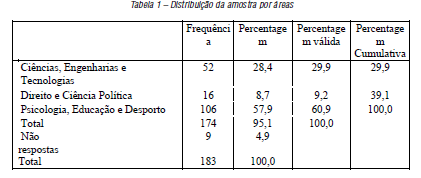 A amostra foi constituída por 183 estudantes universitários, em que a média de idade dos participantes é de 21,8 anos. Pertenciam ao sexo feminino 106 e 71 ao sexo masculino, dos quais 56 estudantes inscritos nas áreas das ciências, engenharias e tecnologias, 16 estudantes nas áreas do direito e ciências políticas; e 106 estudantes nas áreas da Psicologia, Educação e Desporto (Tabela 1).