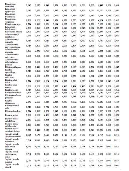 La calidad de vida percibida parece estar especialmente relacionada con las experiencias vitales estresantes vividas (Tabla 3). De este modo, las personas con una calidad de vida percibida más baja indican experimentar un mayor número de emociones negativas derivadas de dichas experiencias estresantes. Asimismo, parece ser que los efectos a corto y medio plazo y el impacto actual de esas experiencias vitales es mayor en personas con una calidad de vida más baja, lo que afecta a todos los ámbitos de su vida, desde la salud física y mental, pasando por las relaciones interpersonales, hasta incluso el ámbito laboral (e.g. Efectos aislamiento, Mmala= 2,143 versus Mexcelente= 0,196, p = 0.01). Esto puede relacionarse con un menor uso de estrategias de afrontamiento activo, siendo más habitual otro tipo de estrategias de tipo emocional o basadas en la negación, la renuncia y la autocrítica (e.g. Afrontamiento-autocrítica, Mmala= 1,001 versus Mexcelente= 0,239, p = 0.01).