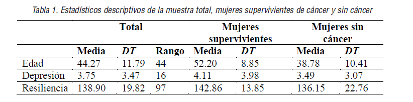 La muestra estuvo conformada por 110 mujeres (40.9% supervivientes de cáncer de mama, 50.9% sin cáncer) cuya media de edad fue 44.27 (DT= 11.79; rango = 25-69). Se administró la Escala de Ansiedad y Depresión Hospitalaria –HADS-57- (Zigmond y Snaith, 1983; adaptación al castellano de Rico, Restrepo y Molina, 2006) y la Escala de Resiliencia (Wagnild y Young, 1993; adaptación al castellano de Novella, 2002).
