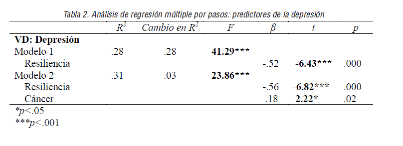 En el modelo 1 la resiliencia explicó el 28% de la varianza de la depresión (R2=.28), mostrando capacidad predictiva negativa estadísticamente significativa (=-.52). En el modelo 2, la capacidad explicativa se vio incrementada de manera significativa en un 3% como consecuencia del efecto de sobrevivir al cáncer (R2=.31), que mostró una relación positiva con la depresión (=.18), prediciendo mayores niveles en mujeres que pasaron esta enfermedad. Los resultados se confirmaron con independencia del efecto de la edad.
