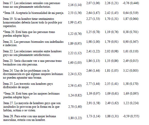 En términos generales, en los ítems sobre LGTBfobia que mayor acuerdo se ha observado han sido “Antes las personas estaban discriminadas por su orientación o identidad sexual, pero ahora ya no”, “La mayoría de hombres gays que son insultados lo provocan por la forma en la que hablan, actúan o se visten”, “Los travestis son hombres gays disfrazados de mujer”, “Aceptaría la bisexualidad de mi pareja” y “Luchar contra la homofobia en los centros educativos es una labor del profesorado y el alumnado homosexual, que son los que se encuentran implicados” (véase tabla 1).