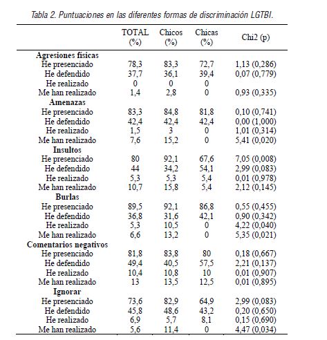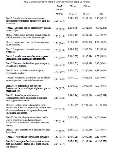 En cuanto a las diferencias entre chicos y chicas en los ítems sobre LGTBfobia, se observaron diferencias significativas, a nivel estadístico, en “La sola idea de sentirme atraído/a físicamente por personas de mi propio sexo me incomoda”, “Respeto a los hombres gays, siempre y cuando no se exhiban”, “Me siento a gusto si me ven en público con una persona claramente homosexual (inverso)”, “Luchar contra la homofobia en los centros educativos es una labor del profesorado y el alumnado homosexual, que son los que se encuentran implicados”, “No iría a lugares de ambiente, en los que se reúnen personas homosexuales, bisexuales y transexuales, por miedo a que me acosen”, “Aceptaría la bisexualidad de un hijo (inverso)”, “Sería chocante ver a una persona trans besándose con otra persona” y “Uno de los problemas con la discriminación es que algunas mujeres lesbianas no pueden aguantar una broma”. En todos los ítems muestran mayor acuerdo los chicos, a excepción del ítem “Luchar contra la homofobia en los centros educativos es una labor del profesorado y el alumnado homosexual, que son los que se encuentran implicados”, donde mostraban mayor acuerdo las chicas.