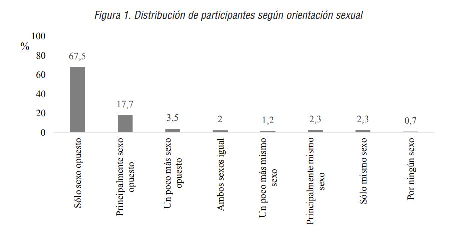 En el estudio, participaron 600 jóvenes estudiantes universitarios, identificándose un 50% como mujeres y el otro 50% como hombres. Según su orientación sexual (ver Figura 1), un 67,5% de participantes reporta sentirse atraída únicamente por aquellas del sexo opuesto, mientras el resto informa sentirse atraída, en distintos grados, por el otro o el mismo sexo: un 17,7% principalmente por personas del sexo opuesto, un 3,5% un poco más por personas del sexo opuesto, un 2% por ambos sexos por igual, un 1,2% un poco más por personas del mismo sexo, un 2,3% principalmente por personas del mismo sexo y un 2,3%, solamente, por personas del mismo sexo. Al mismo tiempo, un 0,7% reporta no sentirse atraído por ninguna de ellos y un 2,8% no contestó a esta cuestión. Respecto a la experiencia sexual, un 82,8% de las personas participantes afirman haber tenido relaciones sexuales previas.