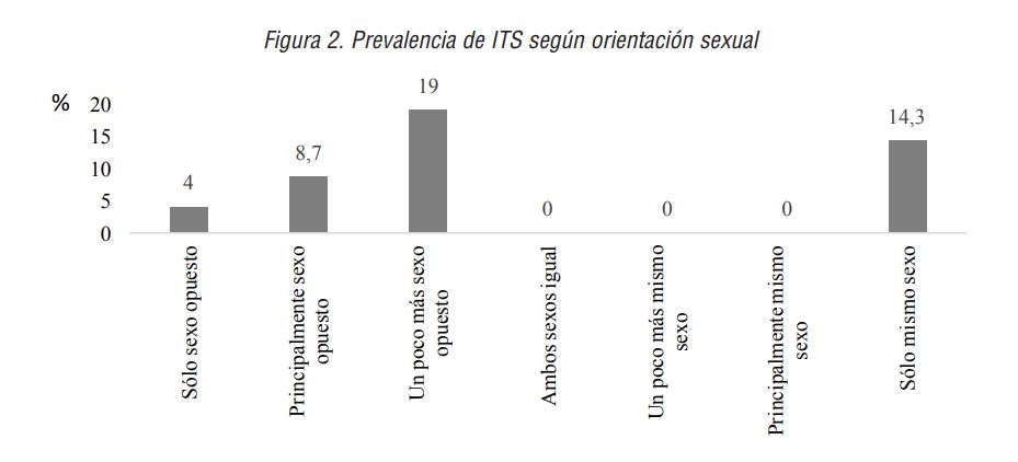 En cuanto a la prevalencia de las ITS, los hallazgos apoyan aquellos estudios que señalan un riesgo notable entre la población joven (Mazzitelli et al., 2016). En este punto, cabe resaltar el perfil diferencial que se observa en función de la orientación sexual. Por un lado, la población más atraída hacia el otro sexo representaría el mayor porcentaje del total de las ITS informadas, concentrando un 70% del mismo. Este resultado, iría en línea con aquellos estudios en los que la población heterosexual muestra una notable incidencia de ITS (Pérez-Morente et al. 2017). Sin embargo, al mismo tiempo, también cabría destacar cómo la población atraída exclusivamente hacia su mismo sexo ocupa per se la segunda posición. Este hallazgo, apoyaría a aquellos otros autores que han mostrado una mayor ocurrencia de ITS, incluyendo el VIH, entre las personas homosexuales (Lelu iu-Weinberger et al., 2019). Seguramente, la tipología de las ITS y otras variables relevantes como el género o factores predisposicionales, podrían modular estos patrones diferenciales (Skakoon-Sparling y Cramer, 2019).