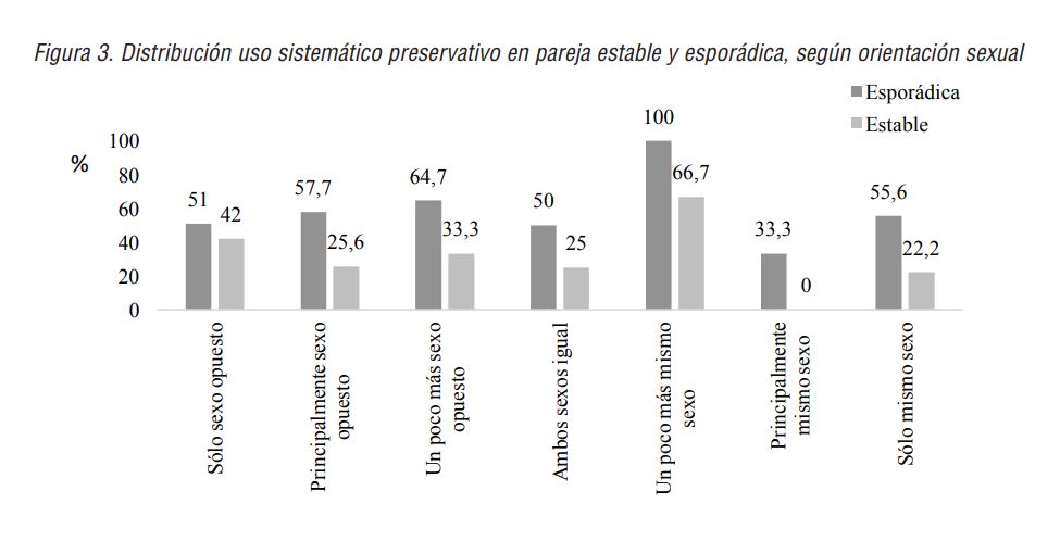 Respecto al uso sistemático del preservativo, de manera general, un 52,8% de participantes lo reporta en el marco de la pareja esporádica, mientras este número desciende al 37,1% en el caso de parejas estables. En función de la orientación sexual, se muestran diferencias estadísticamente significativas en el marco de la pareja estable (Chi2=17,69; p0,007), si bien las diferencias observadas en la práctica sexual con parejas esporádicas no llegan a presentar dicha significación estadística (Chi2=6,59; p0,360).