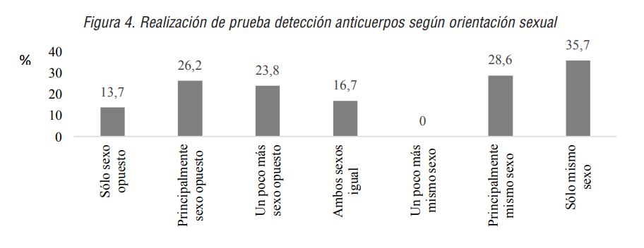 En cuanto a la realización de las pruebas de anticuerpos, también se muestran diferencias en función de la orientación sexual (Norris et al., 2019). En concreto, aquellas personas atraídas hacia el mismo sexo, serían lasque mostrarían una mayor tasa de realización. En este contexto, parece producirse una relación inversa entre el uso del preservativo y la realización de las pruebas. Es decir, se observa cómo aquellas personas que informaron del mayor uso del preservativo, las atraídas un poco más por el mismo sexo, indican no haberse realizado dicha prueba. Por el contrario, aquellas que han mostrado un menor uso sistemático del preservativo, atraídas principalmente por el mismo sexo, se encuentran entre las que reportan una mayor realización de las pruebas de detección de anticuerpos. De esta forma, tal como señalan algunos estudios, la realización de la prueba de anticuerpos no conllevaría un uso del preservativo e incluso, en algunos casos, podría reforzar una falsa creencia de seguridad que mantuviese las conductas sexuales de riesgo (Mueses-Marín, Galindo-Orrego, Tello-Bolívar y Galindo,2018).