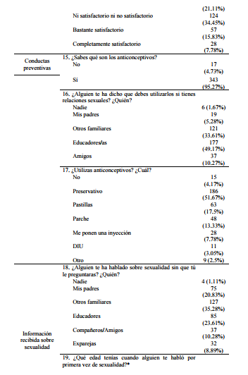 Conducta preventiva: Constituida por 3 ítems se convierte en la dimensión con menos número de reactivos.En ella se incluyen aquellos ítems relacionados con el conocimiento y uso de los diferentes métodos anticonceptivos, indagando sobre si han recibido información sobre ello previamente y quién se la proporcionó.