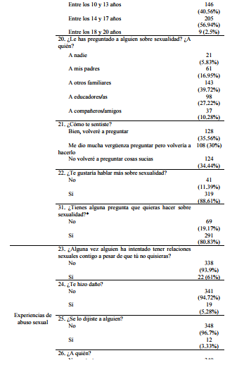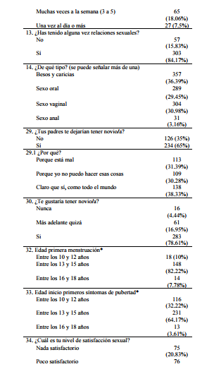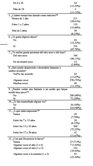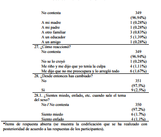 Por lo que respecta a los ítems, se considera que todos cumplen con su propósito, ya que abordan aspectos diferentes y complementarios sin redundar. De los 8 reactivos de respuesta abierta, en dos de ellos (ítems 9 y 31)se tomó la decisión de incluir alternativas dicotómicas (Sí/No) dando la opción de ampliar información mediante el relato de los evaluados. Así mismo, en el ítem 8 se decidió fusionar las alternativas “No” y “No me acuerdo” ala hora de realizar la codificación ya que, aunque presentan matices diferentes, se solapaban las respuestas delos participantes. En el ítem 14, también se fusionaron las alternativas “besos” y “caricias”, ya que se entendió que eran prácticas sexuales que requieren un nivel de intimidad semejante y los participantes reaccionaban de igual forma a ambas alternativas. Además, se eliminó la alternativa “Otro” por la ausencia de respuestas, al igual que sucedió en el ítem 18. Este también fue el caso de la alternativa “No lo sé” del ítem 17. Respecto a los ítems 26 y 27 se decidió incluir la alternativa de respuesta “No contesta”, ya que por el carácter invasivo del contenido de las preguntas muchos participantes no querían contestar y cabe respetar su decisión.