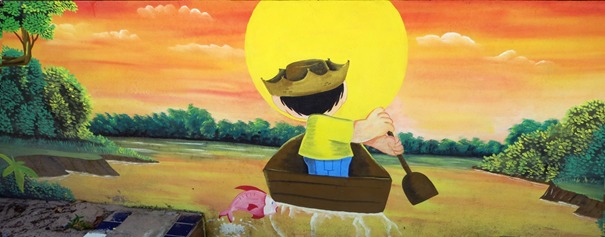 Trata-se de uma pintura em que as águas são amarronzadas e esverdeadas, da cor dos rios locais, mas existe um elemento do imaginário nacional, midiatizado, representado aqui na figura do Chico Bento, personagem criado por Mauricio de Sousa. Chico Bento é a encarnação de uma pessoa humilde, que vive no interior em uma fazenda. Seus quadrinhos não se passam na Amazônia, mas o artista fez uma ligação entre as características interioranas do personagem e a figura do caboclo amazônico.