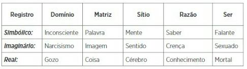Um quadro sinóptico, de dupla entrada, que permite estabelecer convergências e cruzamentos conceituais a partir dos registros. Por exemplo, o imaginário alinhava as categorias de narcisismo-imagem-sentido-crença, compatíveis sem serem sinônimas, e assim por diante. Ao mesmo tempo, a leitura horizontal confronta os desdobramentos verticais, distintos.