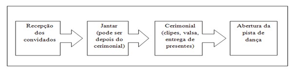 Conforme visto nos discursos anteriormente citados e nos dos outros entrevistados, pode-se sintetizar a sequência de ações das festas de 15 anos conforme o esquema a seguir:
