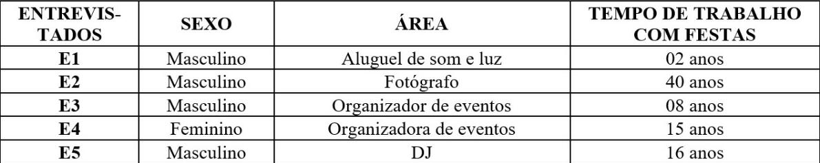 A pesquisa foi realizada com cinco profissionais maringaenses da área de eventos durante o segundo semestre do ano de 2012. Todos eles acompanharam presencialmente a realização das festas de 15 anos em que atuaram, o que permitia a observação de todo o evento. Cada um, no mínimo, já havia realizado seis festas desse tipo. O Quadro 1 revela o perfil dos entrevistados (a partir de agora, por conveniência, e para garantir o anonimato dos entrevistados, o entrevistado 1 será chamado de E1, o entrevistado 2, de E2, e assim sucessivamente):