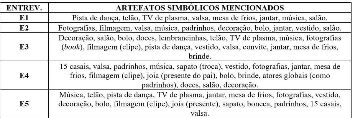 Quanto aos artefatos simbólicos, estes servem como símbolos rituais na forma mitológica de caracteres, ícones, logomarcas ou cores significativas, sendo que muitas vezes assumem a forma de produtos de consumo que acompanham um ambiente ritual ou são nele consumidos (ROOK, 2007). Conforme o Quadro 2, pode-se identificar no discurso de cada entrevistado os seguintes artefatos presentes nas festas de 15 anos: