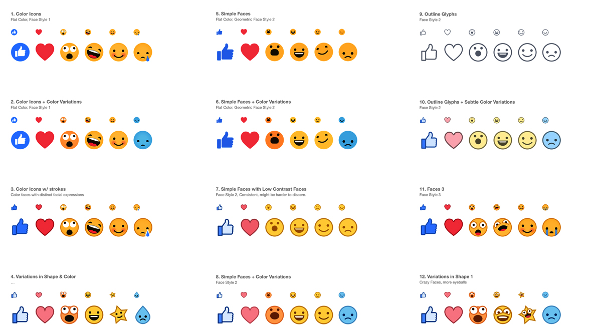 As “reações” não deveriam tornar complexos os comportamentos e as pesquisas apontavam que seria necessário o uso de cinco a dez emoticons (TEEHAN, 2016), porém isso inviabilizaria a disseminação desses ícones. Os testes foram seguindo até chegar no formato atual, capaz de ser compreendido em qualquer cultura, ocidental ou oriental (Figura 2).