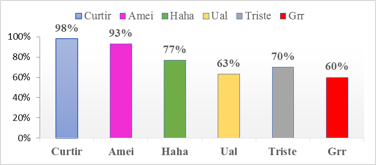 Ficou claro na pesquisa que a demarcação e a intensidade se dão pelos emoticons “amei” e “grr”, e os demais transitam entre os tipos de sentimentos, podendo ser mais ou menos intenso dependendo do conteúdo e da visão daquele que utiliza esses símbolos para expressar sua emoção ou seu posicionamento. Os respondentes deixaram claro que utilizam com alta frequência os emoticons com o objetivo de expor sua emoção, não apenas como um ato de interatividade despretensiosa. Isso ajuda nos processos de análise de engajamento em mídias digitais, contribuindo positivamente para entender o grau de envolvimento do consumidor com determinado conteúdo, empresa ou marca.