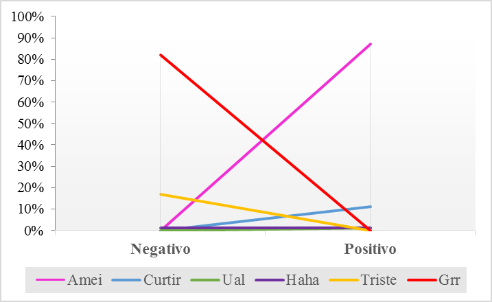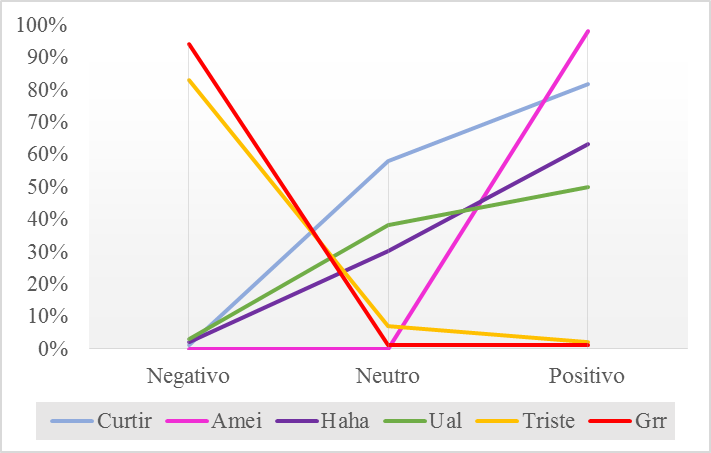 “Amei” e “grr” são os emoticons com maiores cargas de sentimento, polarizados entre o positivo e negativo. Logo, é possível afirmar que aprovação ou reprovação total de um conteúdo passa pelo o uso de um deles. No entanto, não foi possível criar uma escala de intensidade que mostrasse claramente a passagem do emoticon mais positivo para o negativo como nos casos dos demais, em que o “curtir” passa por positivo e neutro e o “haha”, entre positivo, neutro e negativo.