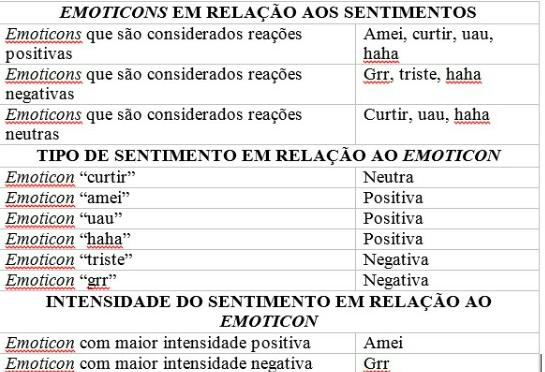 Como parte de uma discussão sobre o engajamento por meio das conversações a partir do uso dos emoticons, devemos lembrar que as reações disponibilizadas podem ser agrupadas como positivas, negativas ou neutras, abrindo campo para a análise de sentimento como uma forma de qualificar o engajamento. A análise de sentimento pode ser utilizada para avaliar e classificar opiniões, agrupando entre o que é positivo, negativo ou neutro (SALUSTIANO, 2016). Portanto, se os emoticons possibilitam a diversidade das reações como forma de expressão das emoções, é possível classificá-los dentro da perspectiva da análise de sentimento. Dessa forma, convergimos com apontamentos de Toaldo e Rodrigues (2015), os quais afirmam que, dada a complexidade da discussão sobre a problemática do engajamento a partir das interações, há necessidade de investigar continuamente esse fenômeno, tendo como objeto as mídias sociais.