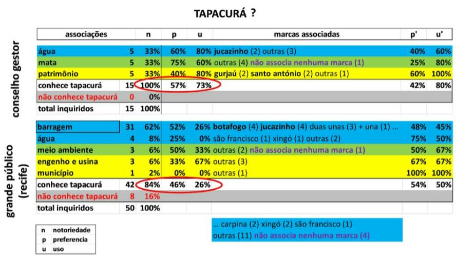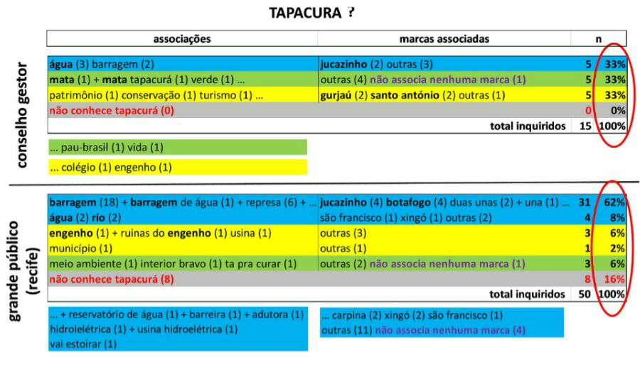 O texto começa pela análise desta resposta, a “resposta à marca”, que foi obtida de dois públicos: os próprios conselheiros e a população do Recife, a grande cidade capital próxima. Os conselheiros, depois de responderem a um breve inquérito sobre as suas associações ao nome Tapacurá, são confrontados com os resultados do mesmo inquérito feito com o grande público e percebem como é importante terem consciência da diferença.