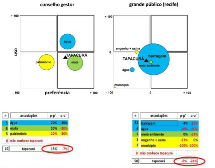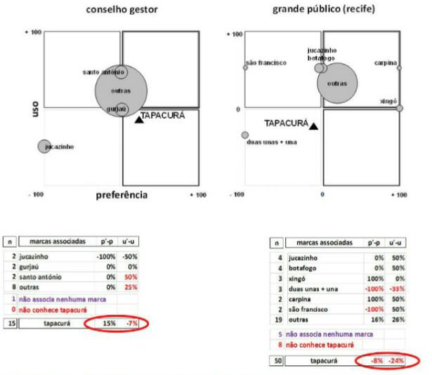 Estes valores globais resultam das associações que o nome Tapacurá gera na mente dos inquiridos. Na “psicanálise” dessa gênese, a dimensão dos círculos indica a notoriedade de cada associação, a posição no eixo das abcissas o diferencial de preferência e a posição no eixo das ordenadas o diferencial de uso. Por isso é que, dos quadrantes resultantes, o inferior esquerdo é o pior, com diferenciais negativos de preferência e uso, enquanto o superior direito é o melhor, com diferenciais positivos de preferência e uso. Dos quadrantes intermédios, o superior esquerdo é negativo porque o uso elevado não é sustentado por preferência, ou seja, usa-se a marca sem a preferir. O inferior direito não é positivo porque a preferência elevada não se converte em uso, ou seja, prefere-se a marca mas não se usa (não se consegue usar? não se pode usar?).