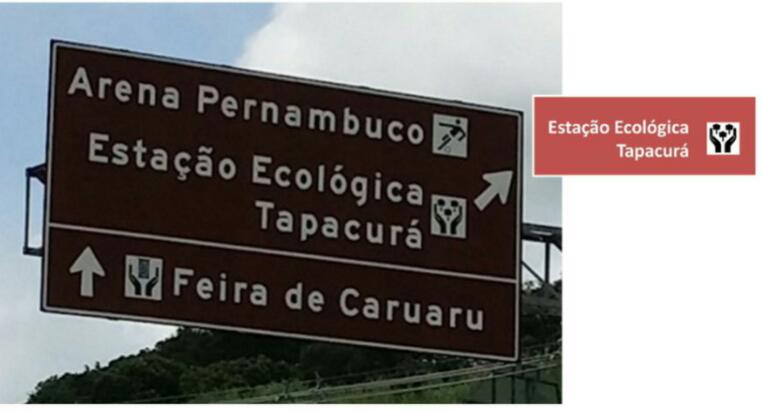 O nome usado na sinalização existente é “Estação Ecológica Tapacurá”. Por consistência, as novas placas rodoviárias que se instalem deverão usar sempre “Estação Ecológica Tapacurá”. Ou seja, usarão o nome distintivo da marca, que é “Tapacurá”, acompanhado do nome genérico da realidade da marca que está a ser referida, neste caso, “estação ecológica” (existem outras referências da marca, como “rio”, “barragem”, “engenho”).