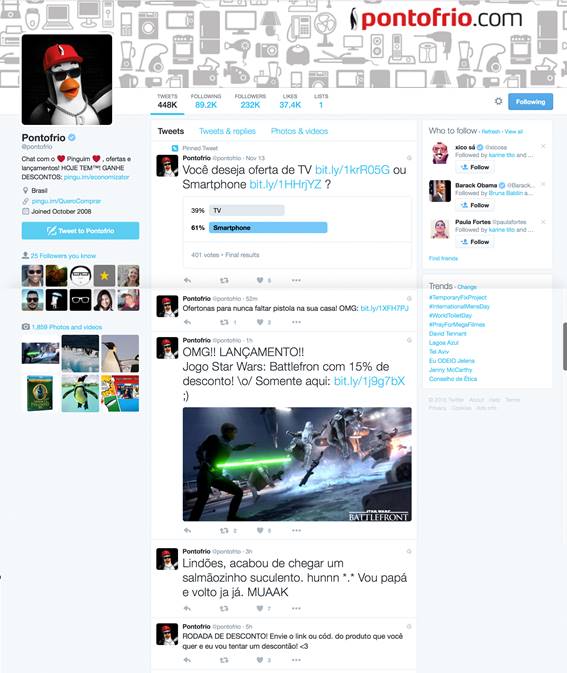 Quem fala em nome da empresa é o Pinguim, personagem que sempre foi associado ao Ponto Frio, mas que ganhou vida própria na internet. É ele quem publica as promoções, oferece descontos e até sugere produtos para os seguidores, sempre antenado com os últimos memes e tendências da internet. (AGUILHAR, 2012)