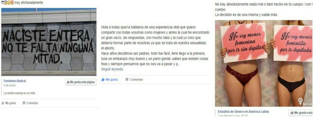 Muitas das conversas ali geradas expressam a vontade de desconstruir a clássica noção do feminismo dos primórdios que concebia o gênero como interpretação cultural do sexo (Butler, 2003). Diariamente são discutidas, entre outros assuntos, a livre escolha da mulher em matéria de identidade de gênero e a desconstrução do estereótipo estético da mulher feminista. No marco da comunidade virtual aqui analisada, apreciamos a recorrência de debates teóricos que, sem serem rigorosos demais em suas abordagens, têm como propósito “mexer em ideias enraizadas na cabeça de muitas mulheres que são um reflexo do doutrinamento patriarcal ao qual somos submetidas desde crianças e das visões biologicistas do gênero como um destino e não como uma escolha”, segundo D., membro ativa do grupo, em entrevista pessoal.