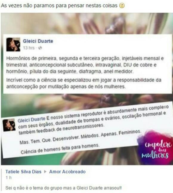 Da mesma maneira, temos notado que no grupo existe uma linha constante de discussão sobre temáticas referidas ao corpo da mulher como objeto de desejo e manipulação: a vergonha estética a que muitas mulheres são expostas no seu dia a dia pelo seu físico; a maternidade como um destino, e não tanto quanto uma escolha pessoal; e o machismo dominante no desenvolvimento de métodos anticoncepcionais que sometem o corpo da mulher a procedimentos altamente invasivos e colocam nela a responsabilidade da proteção sexual, como vemos na seguinte postagem: