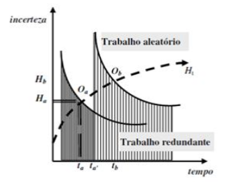 Trata-se, pois, de um trabalho informacional, que caracteriza a informação mais valiosa quanto mais ela é capaz de transformar trabalho morto em trabalho vivo dando-lhe novas formas. “Em cada minuto, ou cada segundo, do processo de trabalho está havendo acréscimo de valor ao trabalho passado, devido às transformações que ele sofre, sob a ação útil do trabalho vivo” (DANTAS, 2006:53) ou, nos termos de Bateson, “informação é qualquer diferença que introduz uma diferença em algum evento posterior” (apud DANTAS, 2006: 47). Uma vez obtido esse evento novo (como os croquis de uma nova coleção), segue a produção de moldes e trabalho redundante: a produção/circulação das roupas da coleção, que acontece ao longo do tempo e com menor grau de incerteza, tal como ilustrado pelo gráfico abaixo: