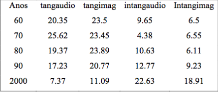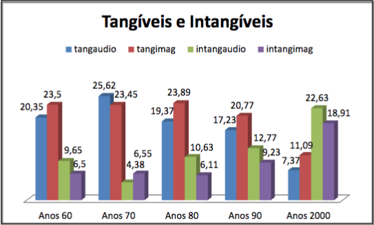 Ao calculamos as médias em segundos de cada variável, separadamente de década por década, obtivemos o resultado representado no seguinte quadro (tangaudio = áudio tangível; tangimag = imagem tangível; intangaudio = áudio intangível; intangimag = imagem intangível):