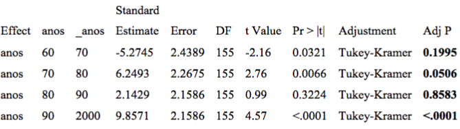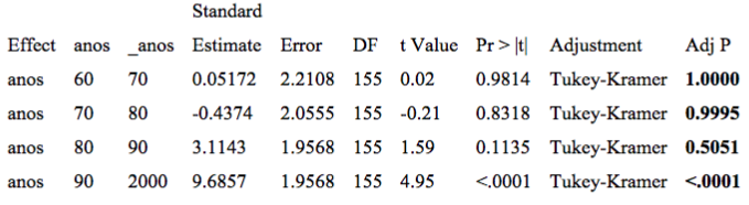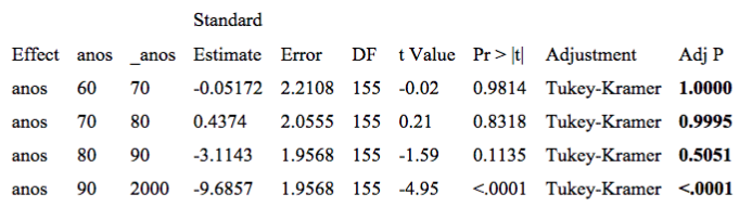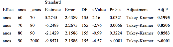 Apenas ao observar a frequência temporal das variáveis, de década a década, percebemos nitidamente uma inversão de resultados no que diz respeito a tangíveis e intangíveis quando chegamos aos anos 2000. Assim, se até os anos 90 havia uma prevalência de elementos tangíveis, tanto em áudio como em imagem, nos anos 2000 os intangíveis passaram a predominar. A partir desses dados, procuramos comparar as médias dos tempos de cada década, considerando cada variável, por meio de uma análise estatística utilizando o programa proc mixed do programa SAS. Comparamos os números obtidos entre as décadas de 60 e 70; 70 e 80; 80 e 90; 90 e 2000. Aplicamos como ponto de corte “P menor que 0,05”, objetivando observar se as diferenças entre as médias obtidas em cada década eram estatisticamente significativas. Os quadros abaixo são o resultado das comparações múltiplas entre as médias, de cada variável.