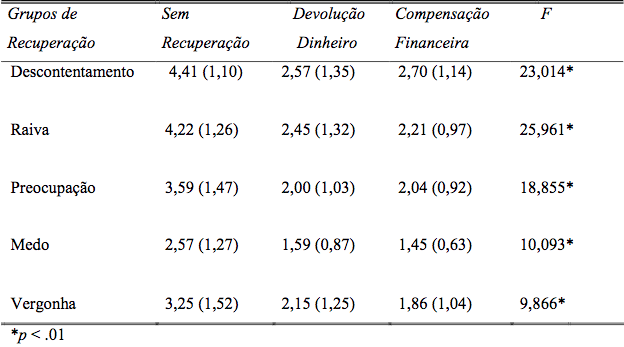 Na análise de variância (ANOVA), ao analisar as emoções negativas após os cenários de recuperação - sem recuperação, devolução do dinheiro uma semana após a falha e devolução do dinheiro no ato da devolução do carro, além de um valor extra (compensação financeira) -, observou-se diferença entre os grupos (between-groups) de recuperação com significância estatística para quase todas as emoções: descontentamento (F (2, 98) = 23,014; p < .01), raiva (F (2, 98) = 25,961; p < .01), preocupação (F (2, 98) = 18,855; p < .01), medo (F (2, 98) = 10,093; p < .01), e vergonha (F(2, 98) = 9,866; p < .01). Para a tristeza não houve diferença entre os grupos (p > . 05).