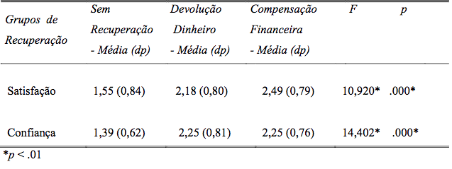 Os grupos dos diferentes tipos de recuperação apresentaram diferenças quanto à satisfação, mostrando que de acordo com a recuperação dada ao consumidor há diferença na percepção de qualidade do provedor mais especificamente no quesito satisfação. O grupo que não teve recuperação avaliou pior do que o grupo que teve ao menos a devolução do dinheiro, sendo que o grupo que teve além da devolução uma compensação financeira avaliou melhor ainda a empresa, apesar das médias serem baixas (Msem recuperação = 1,55 vs. Mdevolução dinheiro = 2,18 vs. Mcompensação financeira = 2,49). Para a confiança, também houve diferença entre os grupos de acordo com o cenário de recuperação apresentado, quem não teve recuperação ficou menos confiante do que quem teve a devolução do dinheiro ou a compensação financeira (Msem recuperação = 1,39 vs. Mdevolução dinheiro = 2,25 e Mcompensação financeira = 2,25).