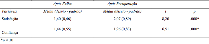 Quanto à avaliação de qualidade da locadora de automóveis, após os cenários de recuperação, a maioria está insatisfeita (Msatisfação pós-recuperação = 2,07; dp = 0,89), e não confiante (Mconfiança pós-recuperação = 1,96; dp = 0,83), a escala foi utilizada do mesmo modo que na avaliação anterior à recuperação.