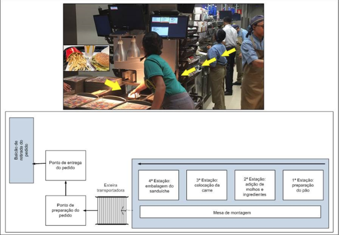 A Figura 1 mostra uma foto e o esquema da linha de montagem do sanduíche e o fluxo até a entrega do lanche solicitado pelo cliente.