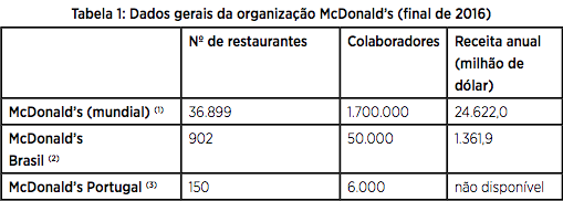 A Tabela 1 mostra alguns números da organização McDonald’s: consolidados do McDonald’s no mundo, do McDonald’s no Brasil e em Portugal. Os dados confirmam a grandeza desta organização e sua grande penetração global.