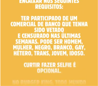 Para participar, basta se encaixar nos seguintes requisitos: ter participado de um comercial de banco que tenha sido vetado e censurado nas últimas semanas, pode ser homem, mulher, negro, branco, gay, hétero, trans, jovem, idoso. Curtir fazer selfie é opcional. (BURGER KING BRASIL, 2019)