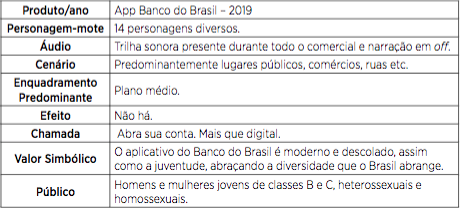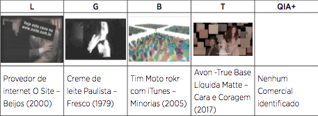 Dentro das representações analisadas em 40 anos de recorte, a metodologia da pesquisa aborda uma análise diacrônica dos comerciais de televisão por serem suportes relevantes de visualização do caráter histórico das relações de poder e de suas consequências políticas e sociais. Dentro de 126 peças analisadas, 23 comerciais contemplam a letra L da sigla LGBTQIA+, 86 da letra G, apenas 1 da letra B, 15 da letra T e nenhum comercial com representações QIA+.
