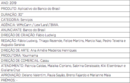 Ao se analisar as representações, num primeiro momento, parte-se para um fichamento dos dados do comercial para que possamos ter as informações técnicas sobre a produção do filme publicitário, em que se identifica o ano da peça, produto, duração, categoria, agência, anunciante, direção de criação, redação, direção de arte, produtora, direção de comercial, atendimento, aprovação e prêmios, se houver.