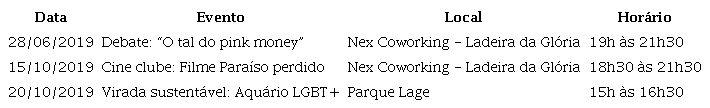 Os eventos tinham dinâmicas diversas, com diferentes intenções discursivas, o que foi importante para absorver um maior volume de visões e comportamentos. O debate sobre o pink money ocorreu no dia 28 de junho de 2019, como parte da programação proposta para a celebração da semana do orgulho LGBT+. Durante o evento, que recebeu cerca de dez pessoas na plateia, quatro convidados engajados com a comunidade LGBT+ debateram sobre a representatividade na mídia e a atuação das marcas. Os principais pontos abordados foram o quanto as ações das marcas são efetivas e contribuem para a luta. Seriam essas ações só oportunismo? Como pode se contribuir, de fato, com essa causa e tirar a população dessa condição marginalizada?