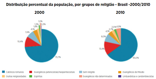 O censo do Instituto Brasileiro de Geografia e Estatística (IBGE) de 2010 considerou a religiosidade no Brasil como dividida nas seguintes classes: católicos romanos; outras religiosidades; evangélicos pentecostais e neopentecostais; espíritas; sem religião; evangélicos não determinados; evangélicos de missão; umbandistas e candomblecistas (Figura 2).