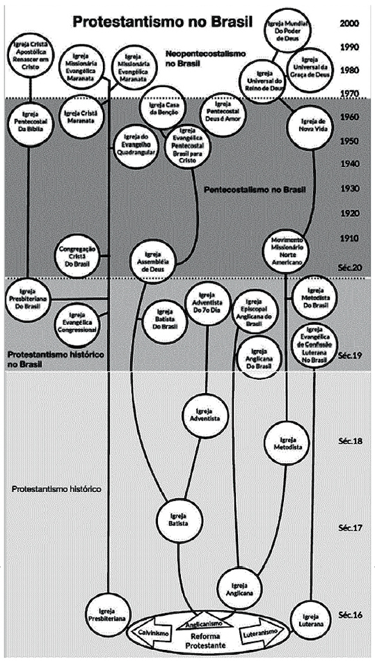 A partir de então, no ocidente, a religião católica se tornou predominante, sendo responsável pela coroação e escolha de reis na Europa até por volta dos anos 1500. Nessa época, se iniciou o movimento protestante, efetivado em 1517 com Lutero, abrindo espaço para uma série de outras religiões cristãs. Desde esse período, essas denominações se espalharam e chegaram ao Brasil com diversas ramificações e vertentes, como demonstra a Figura 3.