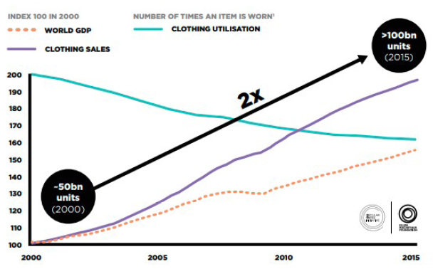 Os duzentos anos de produção e descarte das peças de moda parecem estranhamente destoantes das preocupações em relação ao ambiente (GWOZDZ; STEELEN NIELSEN; MÜLLER, 2017) e ao impacto ambiental da indústria têxil. A biografia de praxe das roupas (KOPYTOFF, 1988) assumia que cada peça seria detida por uma única proprietária para ser, em seguida, descartada e se dirigir a um paradeiro desconhecido. O Gráfico 1 apresenta o forte crescimento nas vendas de peças de roupa entre 2000 e 2015 e a tendência decrescente no total de vezes em que cada item é usado. Assim, os armários tendem a se rechear, sem que se substitua peças desgastadas por novas, mas compondo um acervo mais pautado na volátil categoria do gosto e da identificação pessoal com cada bem.