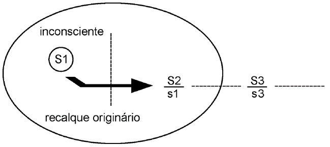 Conforme Dor (1985), a clivagem marca então a divisão do sujeito, na qual ele nasce como sujeito submetido à ordem Simbólica, que fará a mediação de sua relação com o mundo, enlaçando o Imaginário e o Real. Ao fim desse processo, um símbolo de linguagem (S2) designará metaforicamente o objeto primordial do desejo tornado inconsciente (S1), inaugurando as cadeias associativas, metonímicas, do desejo que partem da região inconsciente na direção consciente, e que se manterão em constante deslocamento por meio de traços de evocação (S3 em diante). A Figura 1 representa o esquema desse processo.