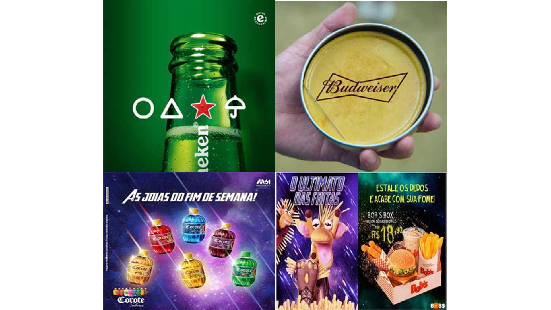 Da mesma forma que a comunicação publicitária pode se apropriar e alimentar o sentimento de FOMO de uma maneira mais direta, pela utilização de uma linguagem mais apelativa, percebemos também a presença de um movimento mais indireto em alguns casos. Com o surgimento de novos conteúdos e tendências, é comum ver no ambiente digital marcas dos mais diversos segmentos se apropriando de signos e símbolos de produtos midiáticos e assuntos da agenda pública para a divulgação de seus produtos e serviços, mobilizando uma interação com os usuários baseada em “assuntos do cotidiano”, potencializando assim o alcance de suas publicações ao envolverem o público de um modo mais sutil. Como pode-se observar na Figura 1 , por meio de uma comunicação intertextual na qual os textos originais dos produtos midiáticos são combinados com os da marca ou produto anunciados ( Blikstein, 2016 ), há uma apropriação de elementos (cenas, personagens, frases) de produtos midiáticos, como séries da Netflix ou filmes blockbuster, por parte das marcas, para a divulgação de seus produtos e serviços.