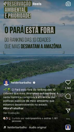 No contexto da marca Amazônia, ele comumente posta sobre o tema, mostrando ações dentro de sua agenda pública – e enfatizando a agenda para a região ( Figura 4 ). No reels em questão, postado em 13 de março de 2023, Helder Barbalho enfatiza que as cidades paraenses não estão entre as que mais desmatam a Amazônia, colando a sua imagem pessoal, a sua gestão e a temática da região. O texto de apresentação, com traços de autoelogio, dizia: “Apaixonado pelo Pará e pela nossa gente. Sou governador do Pará, reeleito com mais de 70% dos votos. O governador mais votado do Brasil”.